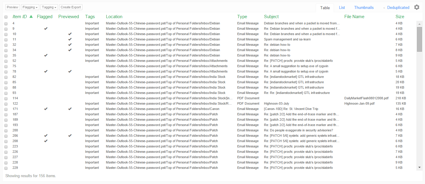 - Location: Name of the location in the original evidence data where the item is stored. For example, an email in a PST file would have a location that would start with the folder and file name of the PST file, followed by the mail folder path inside that PST file.