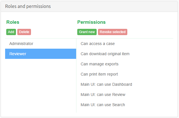 Main UI: can use Dashboard- allow users to access Dashboard view.Main UI: can use Review- allow users to access Review view.Main UI: can use Search- allow users to access Search view.Main UI: can use Report- allow users to access Report view.Can send and receive Instant Messages- allow users to access built-in Instant Messaging feature. Lack of this permission will cause the Instant Messaging side panel to be inaccessible.Can manage and execute case tasks- allow case reviewers to create, edit, delete and execute automated tasks. Lack of this permission will cause the Tasks side panel to be inaccessible.