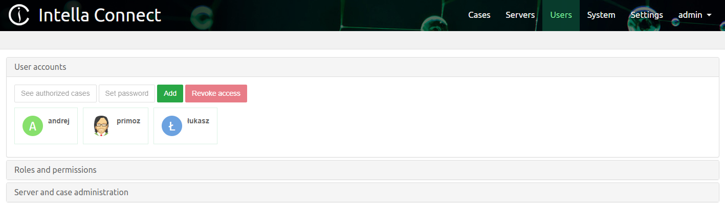 Can manage own cases and authorize reviewers- user with this permission will have access to Intella Connect Dashboard, specifically, sections Cases, Activity stream and About. The cases list will be showing only those cases of which this user is the creator. Additionally, cases which have been shared where user is only a reviewer will also be shown in cases list, however, such user will not be able to manage it.Can manage all cases and authorize reviewers- user with this permission will have access to Intella Connect Dashboard, specifically, sections Cases, Activity stream and About. The cases list will be showing all available cases.Is an Administrator of this Connect Server- allows users to access Intella Connect Dashboard, specifically, sections User management, System notifications, Settings and About.